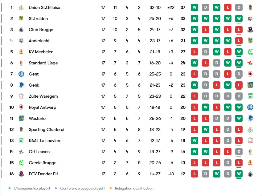 Club Brugge were unable to take advantage of Unionโs slip up. They lost 3-2 away to Sint Truiden in the game of the weekend. Raphael Onyedika gave Club the lead just after the 15 minute mark, only for Arbnor Muja to get the Canaries back on level terms. Ryotaro Ito then converted a penalty conceded by Brandon Mechele. Sint Truiden had plenty of chances on the break but were undone by Clubโs pressure when Kaye Furo equalised. Andres Ferrari came on almost immediately after and his acrobatic winner in the 81st minute moved Sint Truiden into second place in the table.